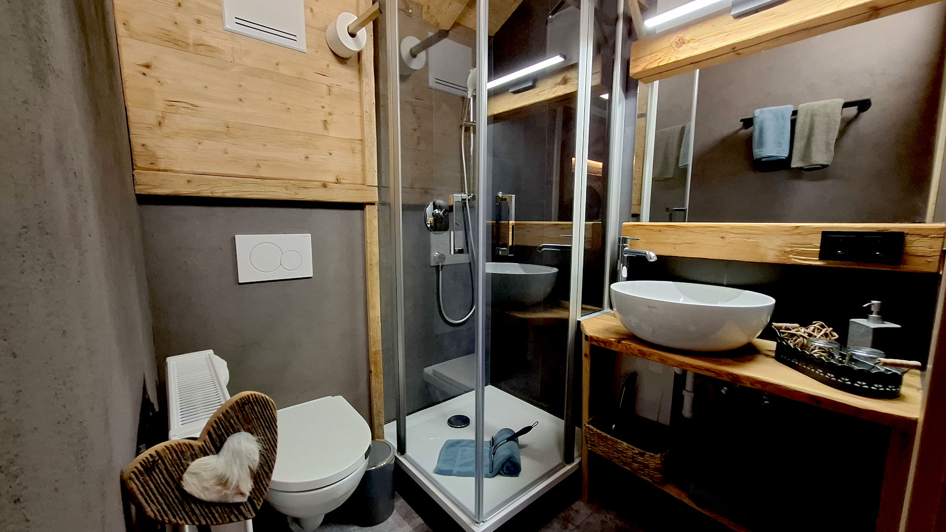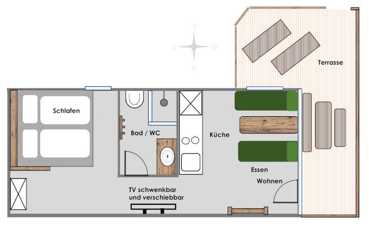 In diesem Chalet befinden sich Wohnküche und Schlafen in einem Raum, sowie ein kleines Bad. Dieses Chalet ist mit Zentralheizung ausgestattet.