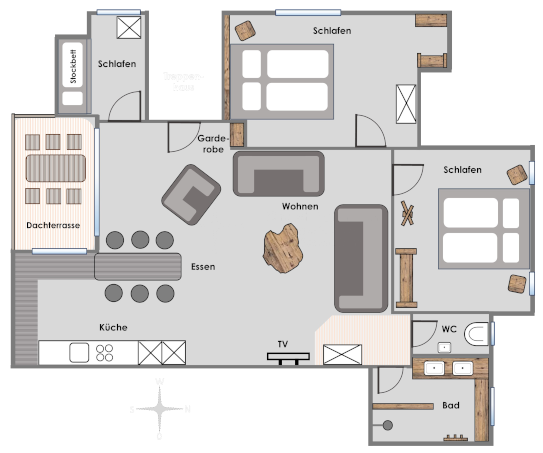 Die Aufteilung besteht aus drei separaten Schlafzimmern, (2 Doppelzimmer und 1 kleines Zimmer mit Etagenbett 1,75m lang), Dusche, separates WC und einer großen Wohnküche.