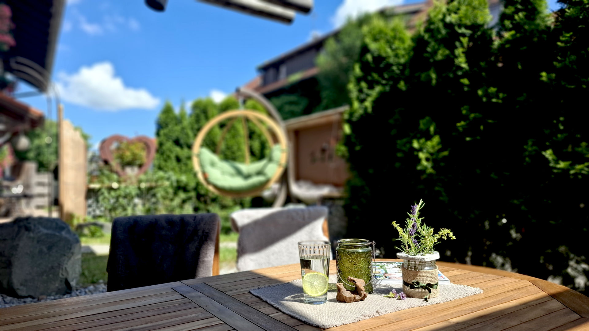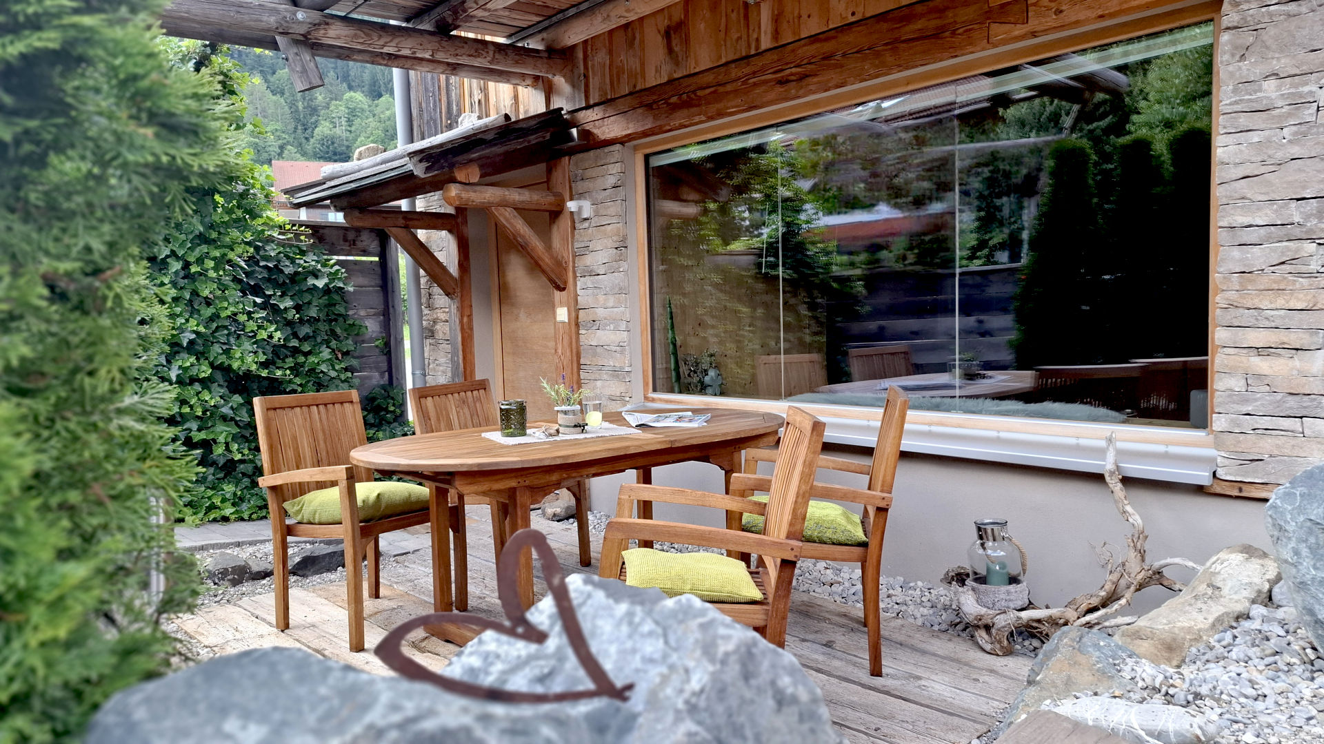 Eine großzügige, private Terrasse mit Bestuhlung trägt zur gemütlichen Urlaubsstimmung bei.
