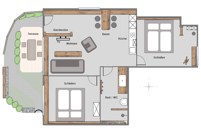 Die Aufteilung besteht aus zwei separaten Schlafzimmern, Dusche/WC und einer großen Wohnküche.